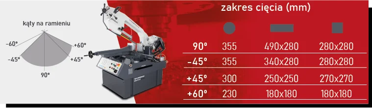 Przecinarka taśmowa z ruchomym ramieniem (zakres od -45° do +60°) i hydraulicznym opuszczaniem to solidne, precyzyjne urządzenie idealne do profesjonalnych zastosowań. Wyposażona w żeliwną ramę, tensometr napięcia taśmy, ergonomiczny panel sterowania oraz system chłodzenia, zapewnia niezawodność i wygodę pracy. Maksymalna szerokość cięcia wynosi 490 mm.
